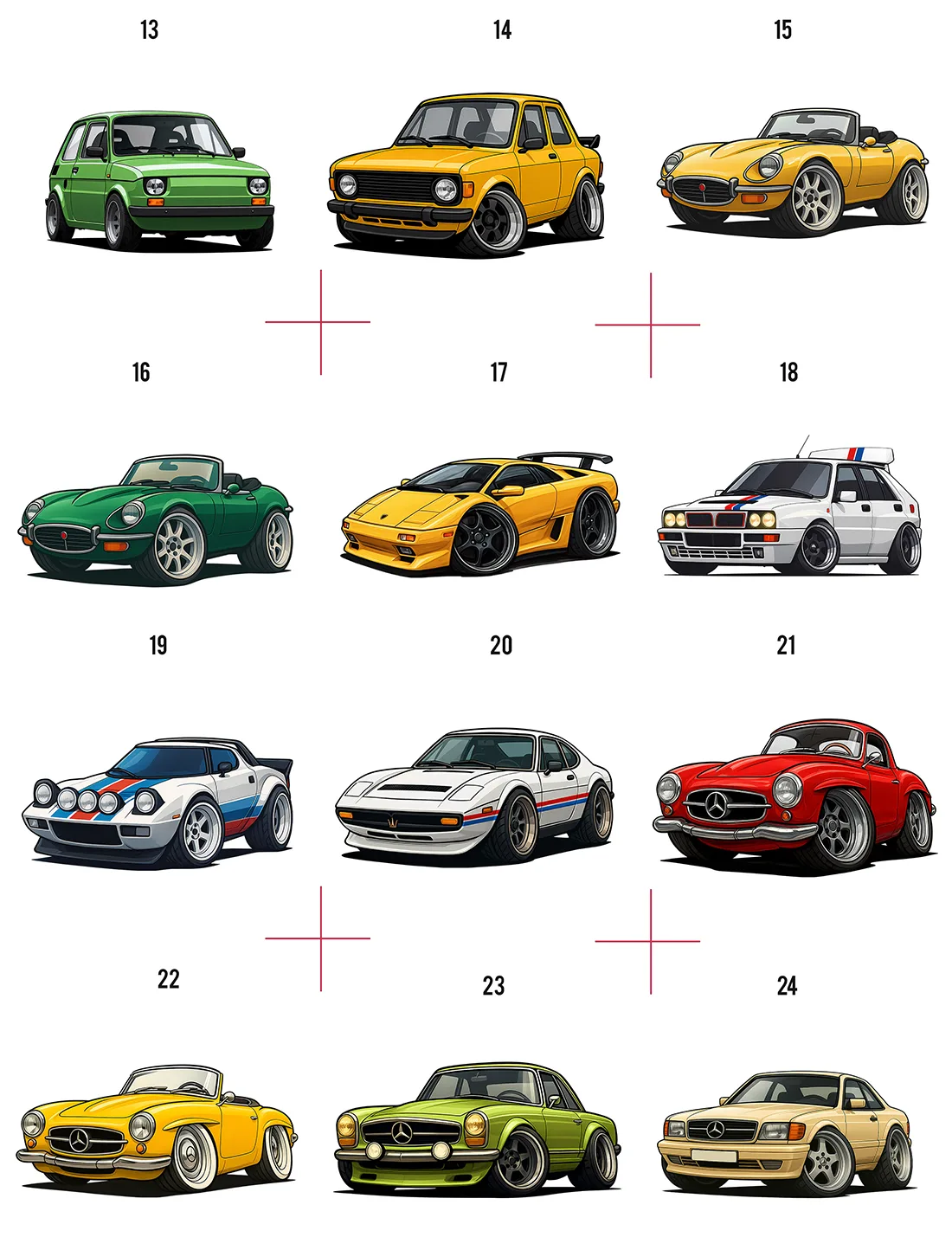 W tym zestawie zebraliśmy legendy, które na zawsze zapisały się w historii motoryzacji. To nie są przypadkowe ilustracje – to ikony designu i osiągów.